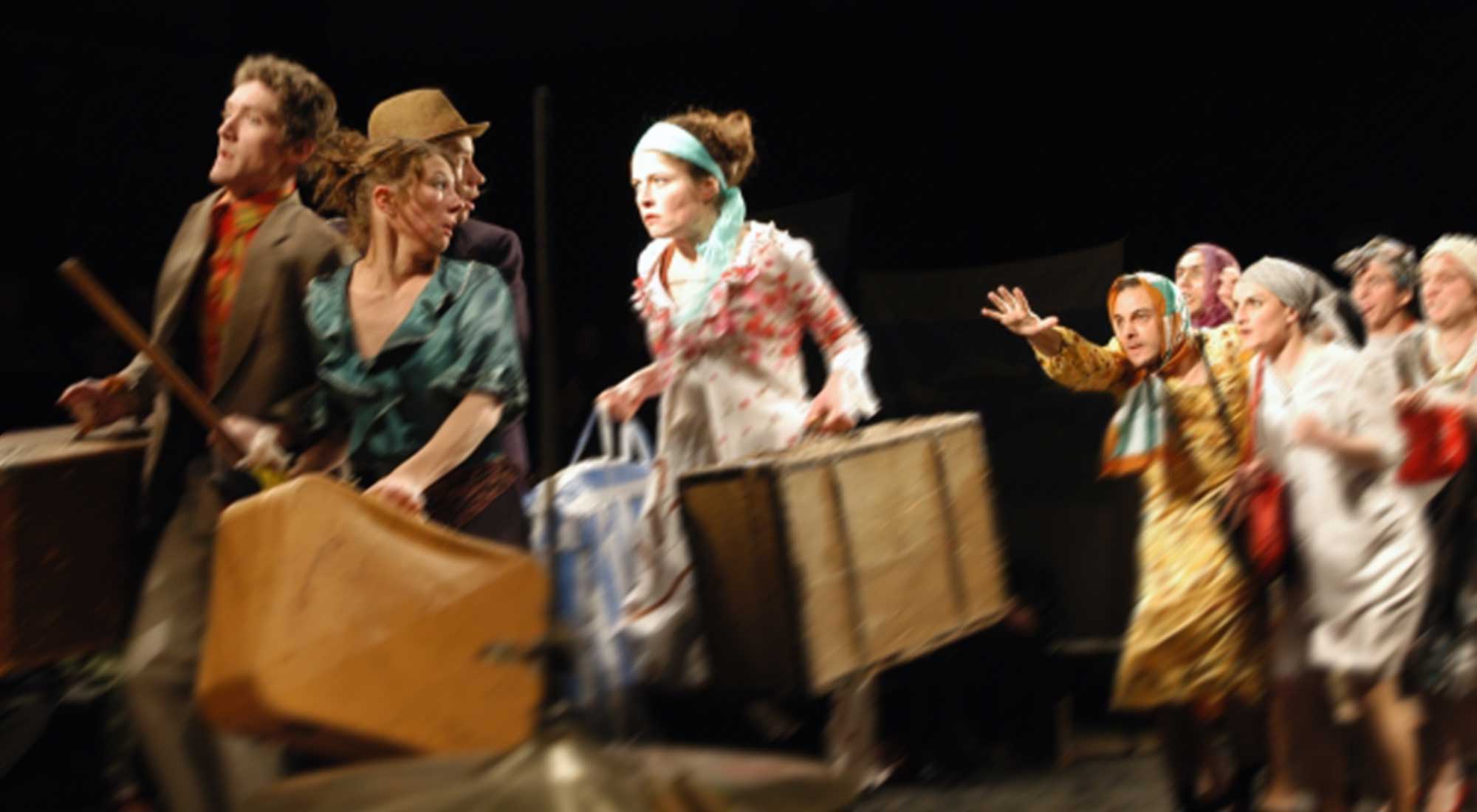 Entre « deux draps et quatre tréteaux », les onze comédiens évoluent dans cet univers cruel et poétique. Dédoublements, répétitions, situations burlesques, masques, maquillage, naïveté, rythment la vie de ces personnages frénétiques et fortement dessinés.
