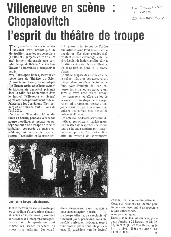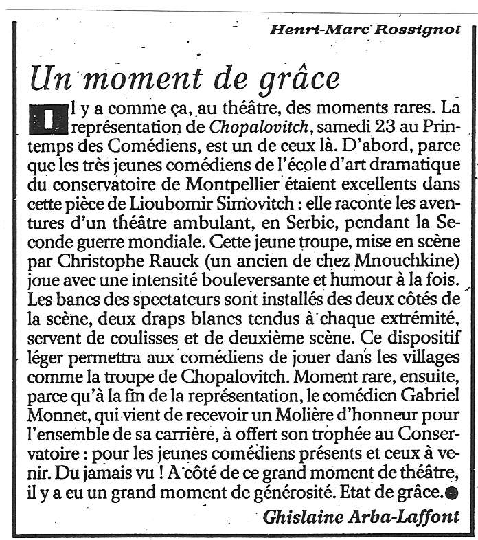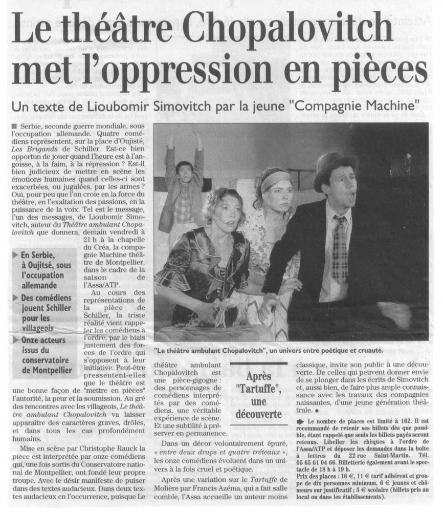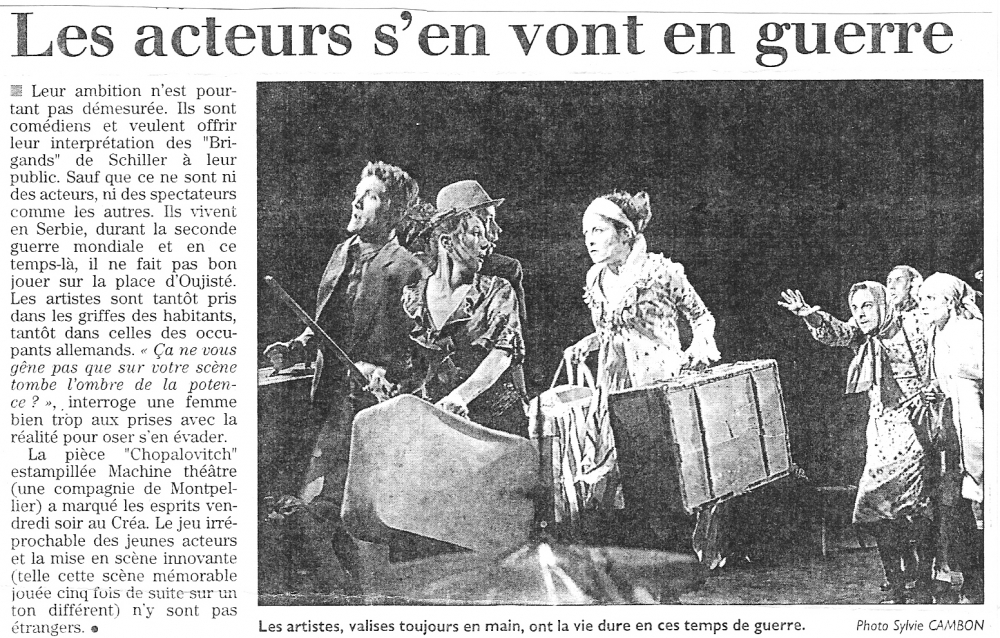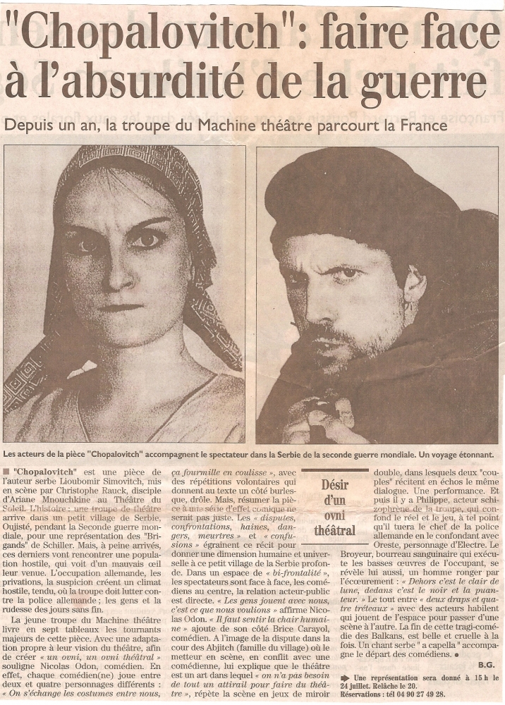 En janvier 1999 nous rencontrons Christophe Rauck, metteur en scène issu du Théâtre du Soleil. C'est avec lui que nous adaptons Le Théâtre ambulant Chopalovitch de Lioubomir Simovitch.