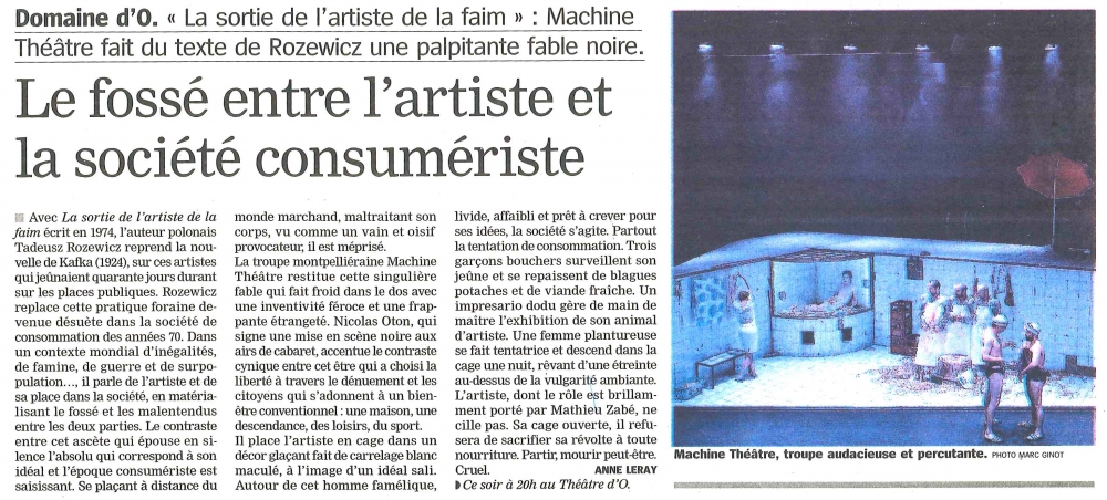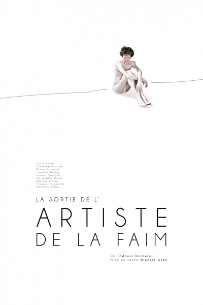 Un homme se présente sur la scène, c’est Tadeusz Rózewicz, il nous parle de la difficulté à ré-écrire la nouvelle de Kafka Un artiste de la faim et des problématiques de son « héros » ; à côté, sur une table sont installés l’artiste et une journaliste. L’artiste nous parle de son art, de son rapport aux autres artistes de la faim qu’il trouve inauthentiques car plus mondains. De cette forme de conférence, le rideau s’ouvre et l’on découvre un parc où l’on a coupé un arbre pour y installer la cage de l’artiste de la faim. Devant la cage, trois garçons bouchers surveillent nuit et jour que l’artiste ne mange pas. Des coureurs viennent faire leur jogging, des mères promènent leurs triplés ou quintuplés, l’orchestre de la ville répète, l’impresario, un homme monstrueusement gros engueule sa femme car le nombre de spectateurs de l’artiste de la faim diminue, ils n’ont plus d’argent, l’artiste de la faim est démodé.