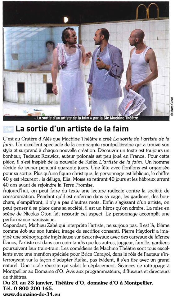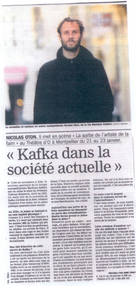 Un artiste de la faim. Rózewicz lit cette nouvelle de Kafka en 1956. Elle va le hanter pendant près de vingt ans. Vision cauchemardesque et inquiète de l'absurde, désuète et néanmoins implacable ascèse exhibée d'un homme qui n'a pour révolte que sa faim et la donne en pâture. Vision prophétique de la société du spectacle, carnassière, effroyablement cynique ; laquelle met en scène et dévore dans une désolante confusion jusqu'au plus intime et ne se repaît de rien. Vision de nos régimes démocratiques conservateurs du monde marchand qui enferme les individus dans des boîtes. De conserve.