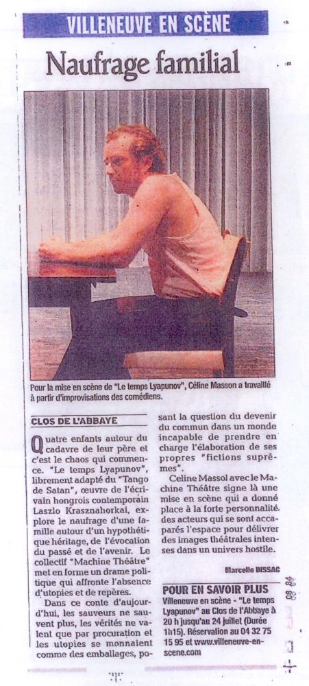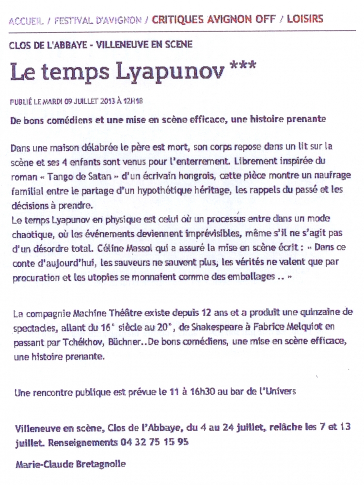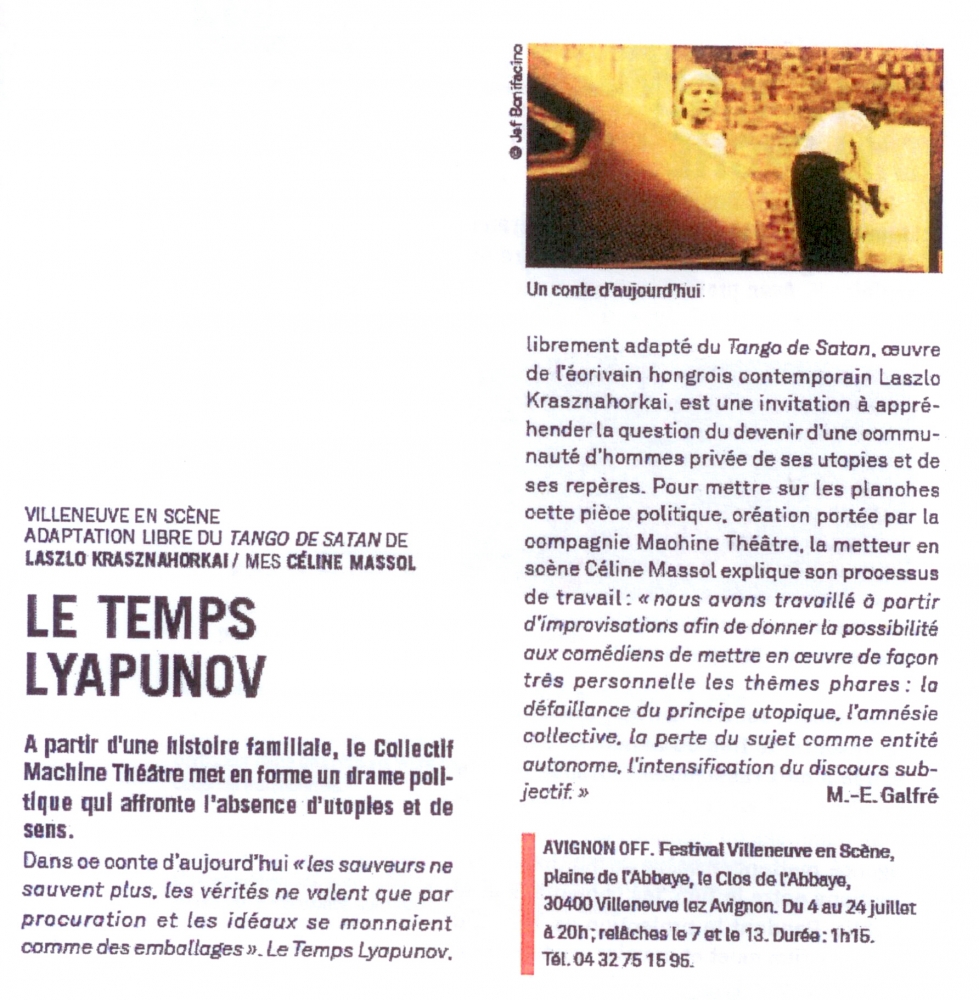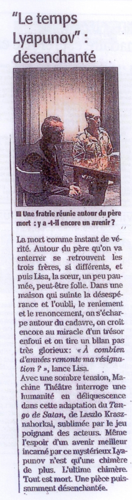 Comme une manière d’ausculter le vide à partir duquel il serait possible de refonder une communauté, Le Temps Lyapunov explore le naufrage d’une humanité incapable d’être seule créatrice de ses propres vérités. D’abord, il y a un mort, le père, puis un second, la sœur. Entre ces deux désastres, le temps simple et cruel du partage, des décisions, de l’héritage, la bêtise des habitudes qu’on construit en famille et qu’on désosse ensemble. C’est alors que surgit l’élan du changement dont on croit toujours qu’il viendra du dehors : pour les trois frères, l’occasion du renouveau est trop belle pour ne pas être saisie. Ils s’en remettent entièrement à la sauveuse providentielle pour la promesse d’une nouvelle vie. L’affaire tourne court et le rêve se révèle être une belle arnaque. Dans ce conte d’aujourd’hui, les sauveurs ne sauvent plus, les vérités ne valent que par procuration et les utopies se monnaient comme des emballages, posant la question du devenir du commun dans un monde incapable de prendre en charge l’élaboration de ses propres « fictions suprêmes ».
