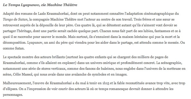 En 2012, nous avons ouvert un chantier de création à partir d’une adaptation du Tango de Satan de Laszlo Krasznahorkai proposée par Frank Ferrara. Ce travail fut pour moi l’occasion de découvrir un auteur, une langue prête à épingler sur le vif les processus de décomposition et aussi une invitation à appréhender le collectif du point de vue de son manque utopique.