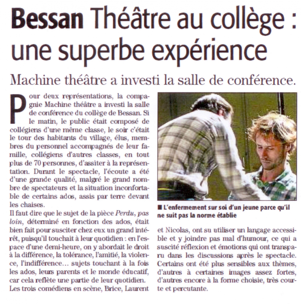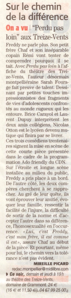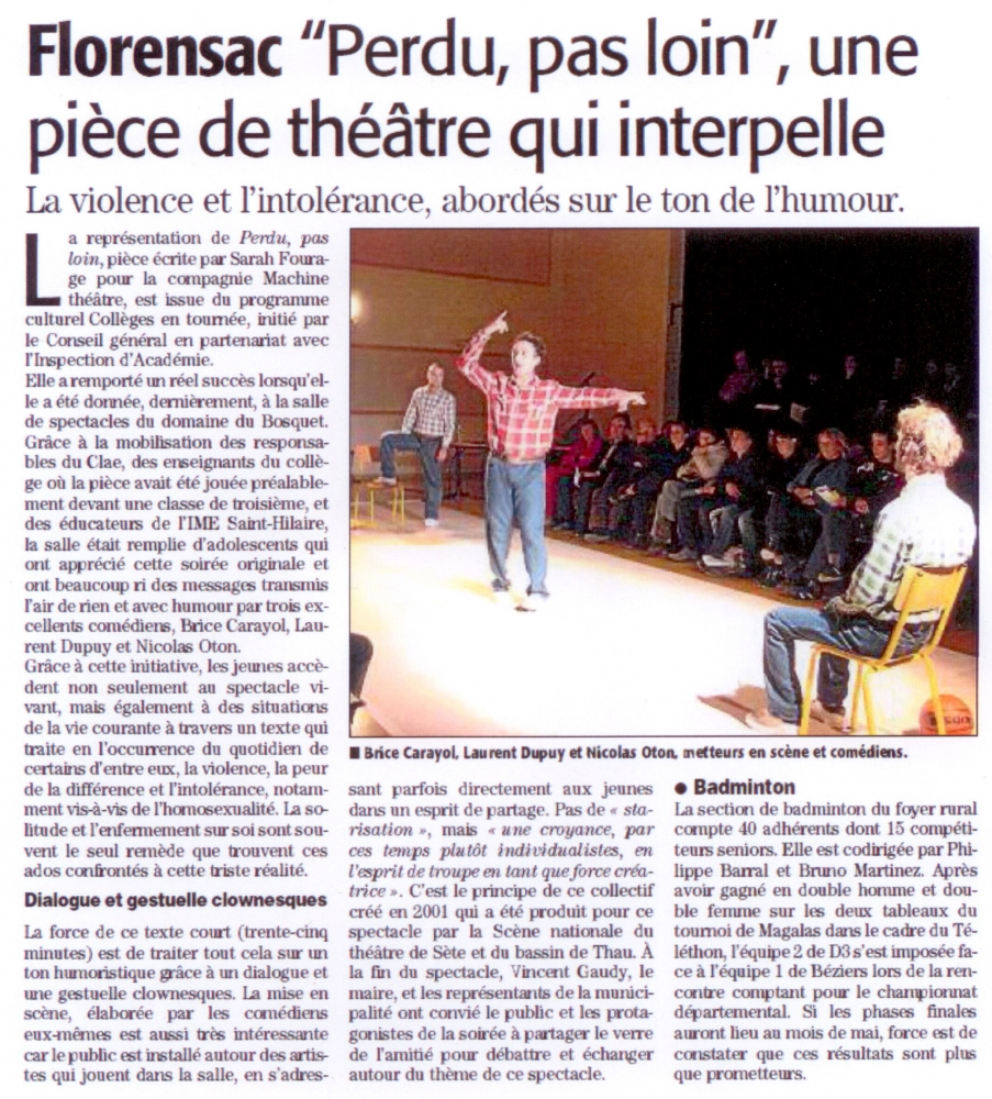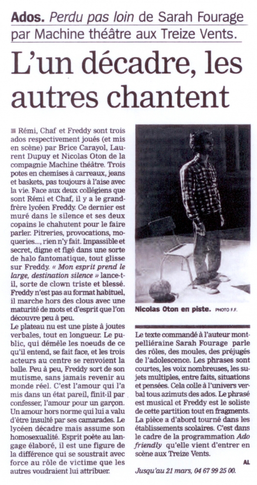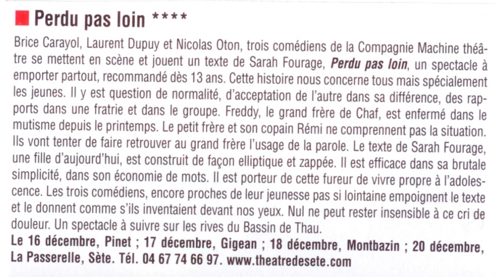 En 2010, en effet, elle a écrit pour l’équipe de Machine Théâtre la pièce Les Candidats et revient en 2011 avec Perdu pas loin, proposé dans le cadre de « Collèges en tournée ».