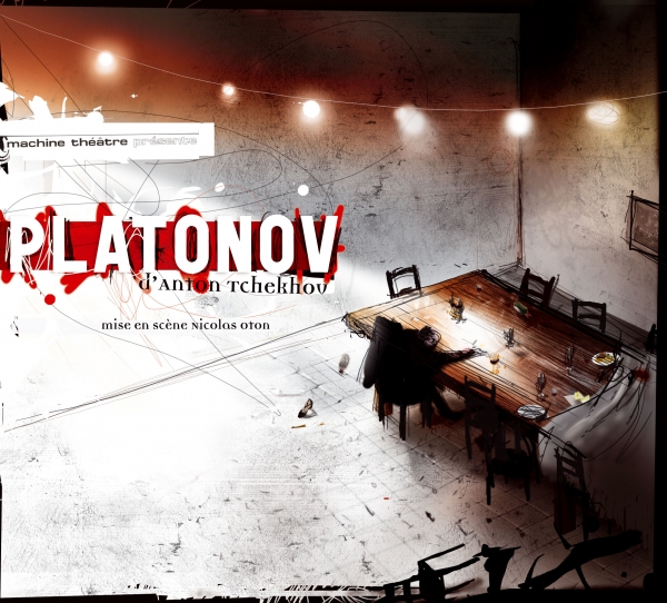 Je vois une terrasse carrelée de tomettes, une fontaine, la forêt qui vient envahir l’espace imposant d’un intérieur bourgeois. Un bureau trop lourd, des costumes trop grands, une table, des bouteilles et le repas qui n’arrive pas. Je vois des lampions, une fête mêlée de silences, d’esclandres, de regards fuyants, des corps en déséquilibre. Je pense au Songe d’une nuit d’été. Je vois un train modèle réduit, le tableau noir d’une salle de classe. Des chaises vides. Les protagonistes comme collés au mur ne pouvant échapper à leur situation. Un second plan comme voyeur du premier. Des rendez-vous ratés. La cupidité des tranquilles. La chaleur écrasante et la propriété que l’on vend. J’imagine une grande soif de désir, d’amour, d’ivresse, de scandales. La fin d’une partie d’échecs. Un revolver posé devant la glace et cette mort absurde de Platonov, parce que nous ne savons pas vivre, puis le silence et ses derniers mots : « Que faire ? Enterrer les morts et réparer les vivants ». Voilà notre seule vérité, la mort.