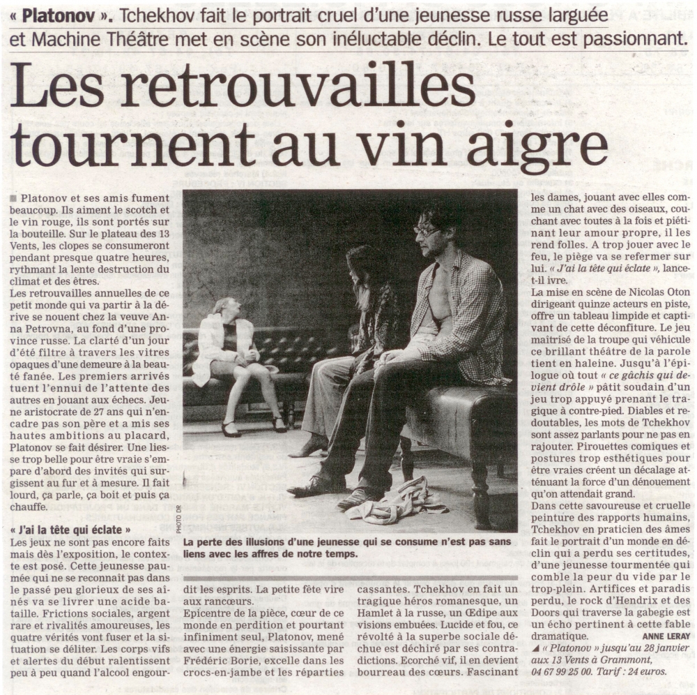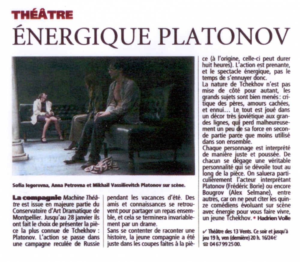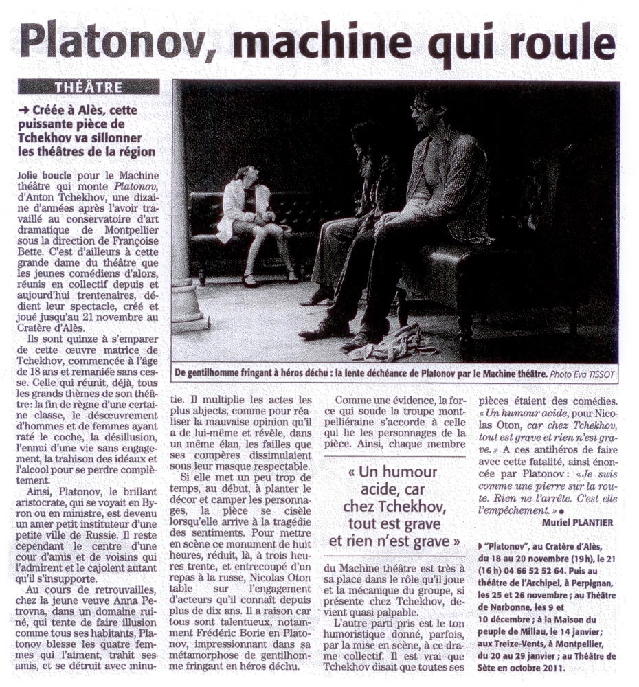 Platonov parle de la jeunesse. Elle ne parle pas de ses illusions et de ses idéaux mais déjà de sa déconfiture. Tous sont vieux avant l’âge. Les corps sont souples mais les passions déjà menacées. De là sans doute, la crainte de l’assèchement et la panique de l’ennui. De cette dichotomie naît un humour acide. Ce gâchis devient drôle...