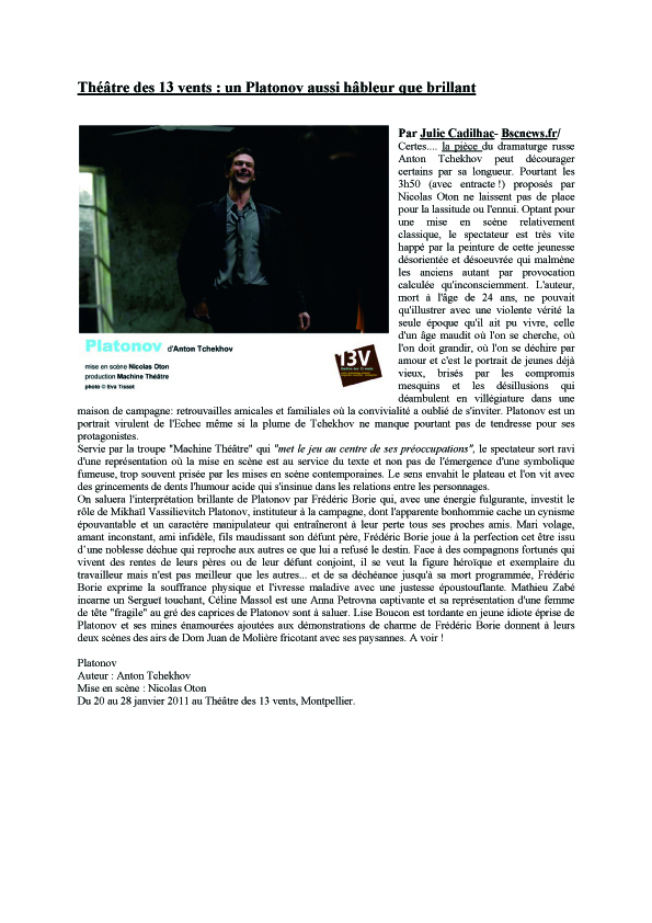 Mais Platonov est aussi une comédie qui donne envie de vivre mieux, sans mensonge, une fête des sens et de l’intelligence : « L’homme deviendra meilleur quand nous lui aurons donné la possibilité de se voir tel qu’il est ».